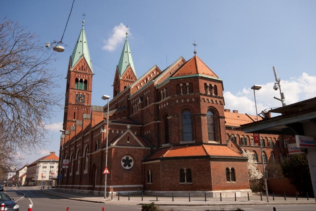 Today’s church with the monastery was built between 1892 and 1900 on the site of the previous Capuchin church. It was built by a Franciscan, friar Kalist Heric from plans by Viennese architect Richard Jordan. The building is in Pseudo-Romanesque style and the façade is adorned by two imposing 58-metre towers.